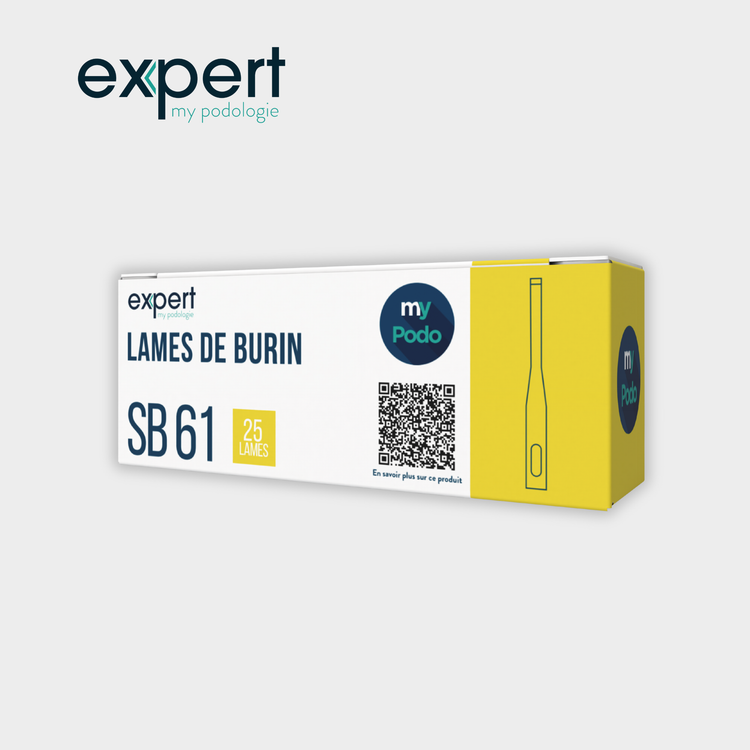 Caractéristiques générales : • Boîte de 25 lames de burin stériles, prêtes à l’emploi • Conçues pour les soins de pédicurie-podologie • Disponibles en simple biseau ou double biseau selon la technique recherchée • Deux largeurs au choix : 1,7 mm ou 2,7 mm • Lames à usage professionnel offrant une coupe précise et nette • Conditionnement stérile garantissant une hygiène optimale • Compatibles avec les manches de burin standards • Usage réservé aux professionnels de santé • Disponible en deux modèles : Simple biseau ou double biseau